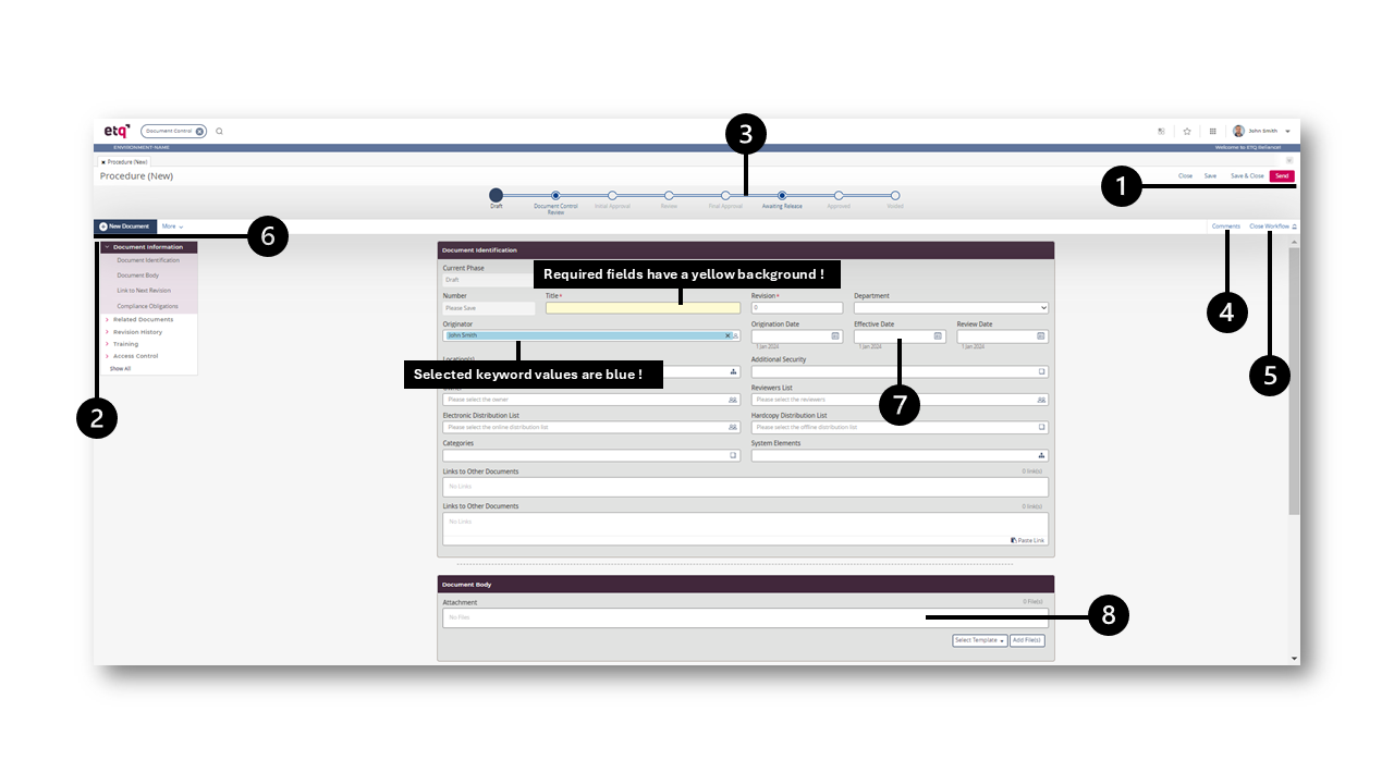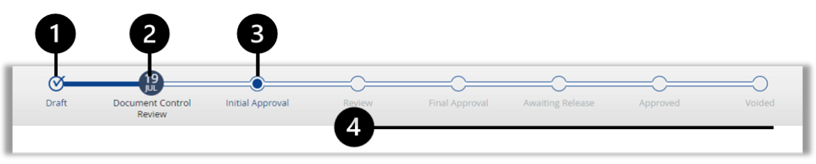 The document workflow is different based on the document type selected. Some documents have no workflow as they are non-workflow documents, typically profiles. The workflow has phases and allows you to send the document between them.